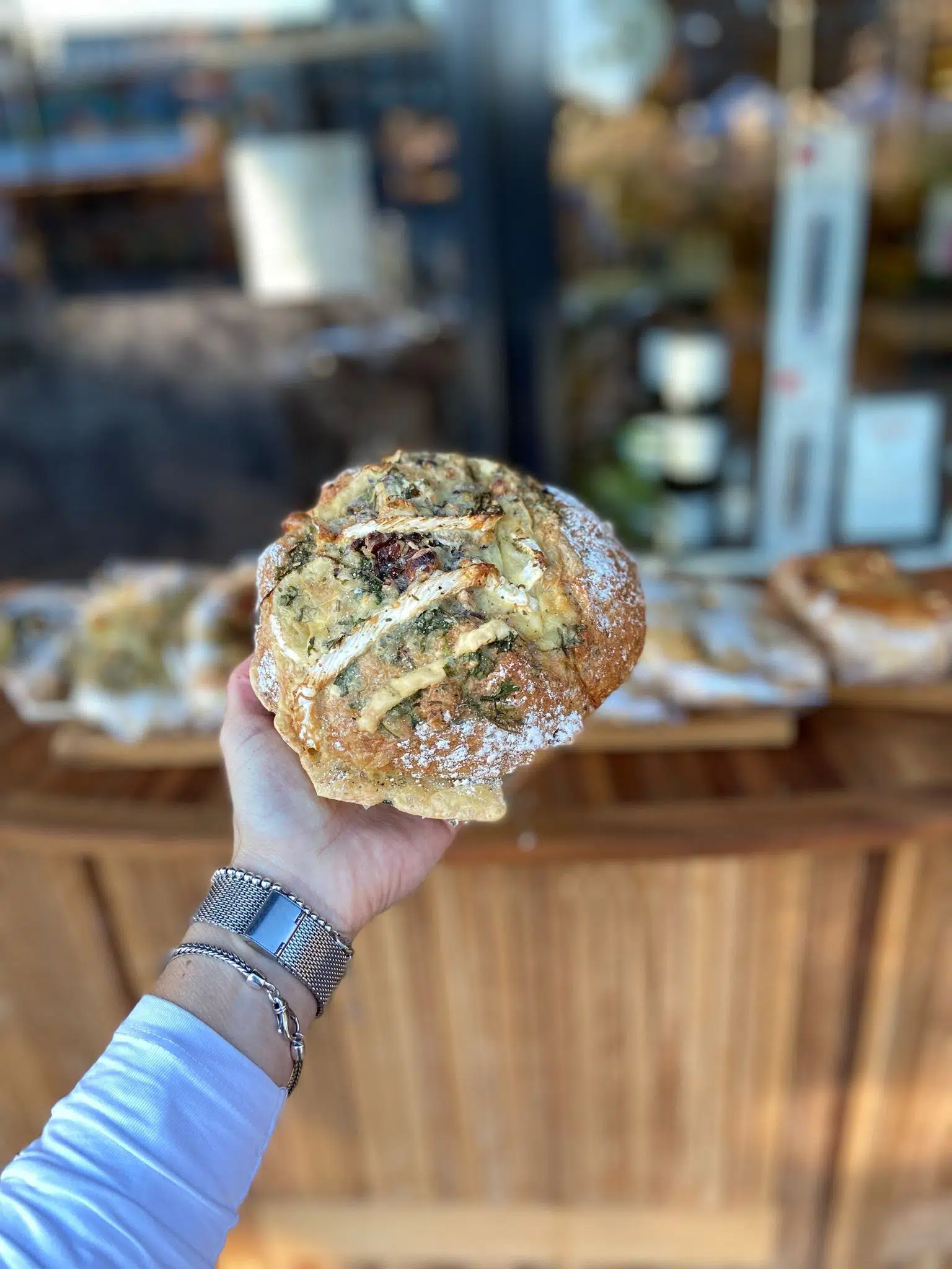 Een mooi volkoren desem brood met hazelnoten er doorheen. Bovenop het brood een kruidenmengsel van bladpeterselie, kervel en dragon en geroosterde hazelnootstukjes. Gegarneerd met een volle laag boeren camembert.
